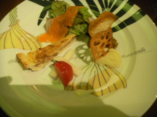 前菜。一人一皿ずつ。右上の、パテ(pate)は、和牛(日本原産の高級牛肉)の、パテ(pate)。