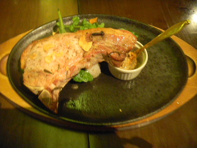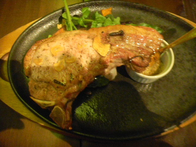 写真以下2枚。私が食べた、メイン(main)料理。骨付き、富士桜(fujizakura)pork(山梨(yamanashi)県産の、高品質な豚肉)。