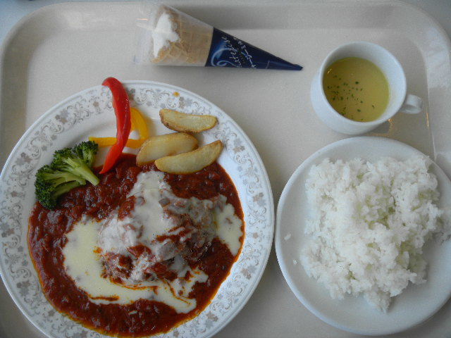 写真以下。一応、食べ物の写真も、ちょっと。。。この日、このスキー場(シャトレーゼ(Chateraise)スキー場)の、カフェテリア(cafeteria)形式のレストランで、私が食べた昼食。チーズ(cheese)ハンバーグ(hamburger steak)。