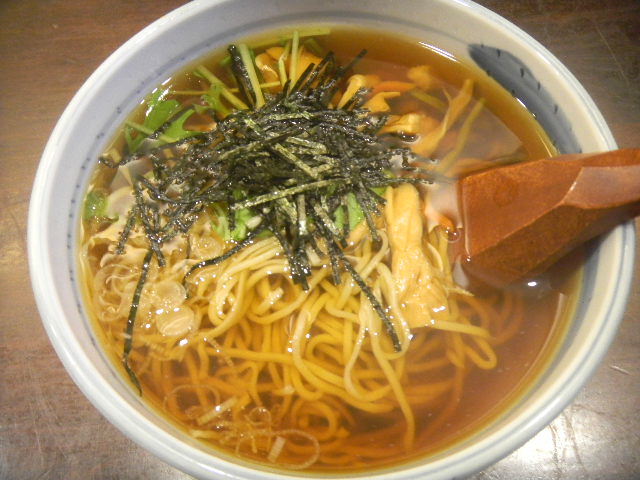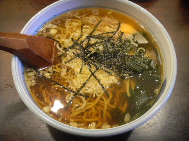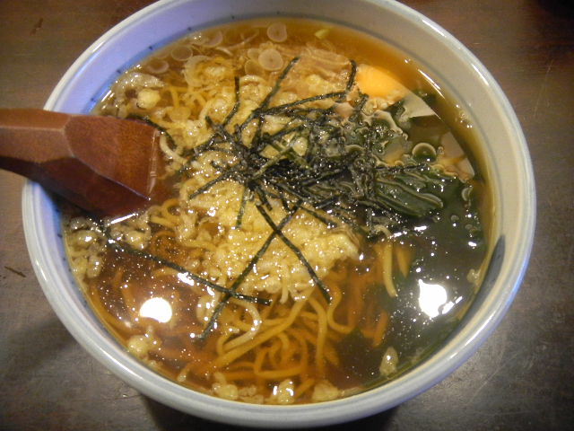 写真以下2枚。私が食べた、暖かい、狸(tanuki)蕎麦(下の補足説明参照)。