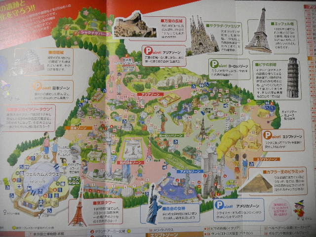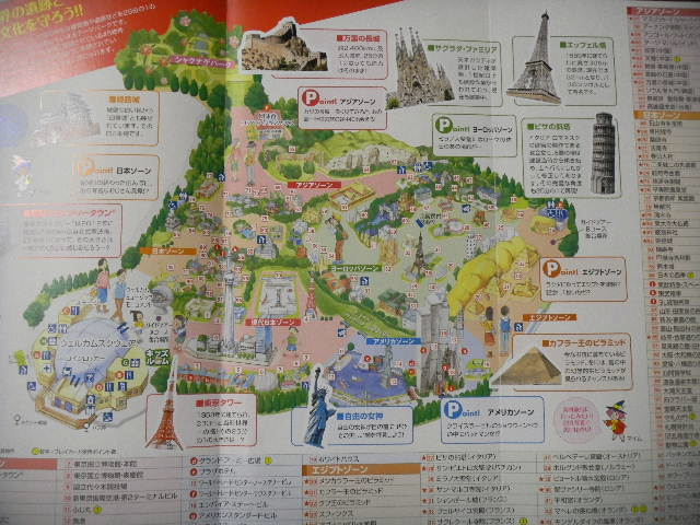 사진 이하 2매.토부(tobu) 월드 스퀘어(World Square)의 원내의 지도.토부(tobu) 월드 스퀘어(World Square)의 팜플렛(leaflet)보다...약 76,500평방 m( 약 23,000평)의 부지에, 세계 유산(UNESCO World Heritage Site)에 등록되어 있는, 45의 건조물을 포함한, 100이상의, 온 세상의 건조물이, 실제의 크기의, 25분의1의 크기의, 매우 정교한 모형으로, 재현되고 있습니다(온 세상의, 유명한 건조물이, 재현되고 있습니다만, 국별로 보면, 일본의 건조물이 압도적으로 많아, 전체의 반 가까이가, 일본의 건조물이 되고 있습니다).모형의 일부에는, 움직이는 장치가 있습니다.