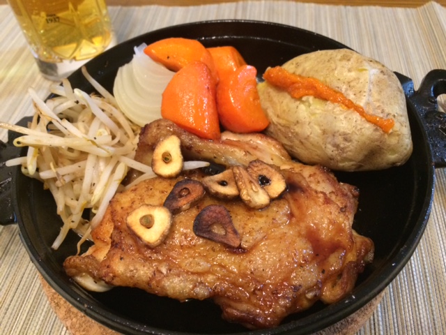 弱火でじっくり焼いたので脂も落ちて皮がパリパリ、でも鉄鍋のせいか肉はジューシーに。
