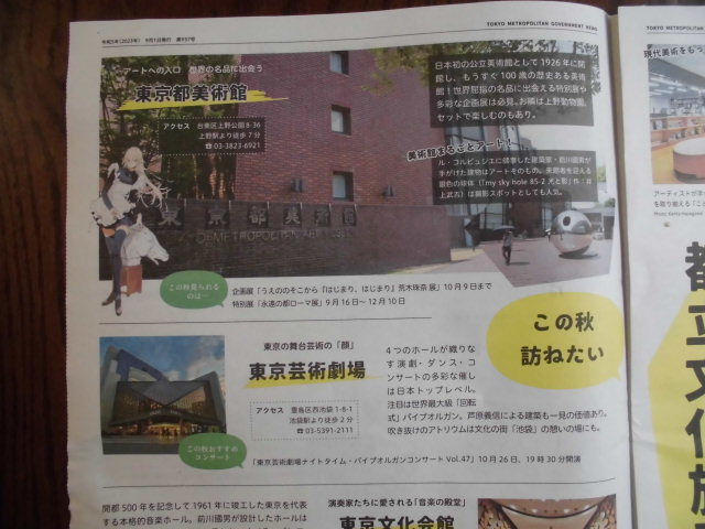 사진 이하 5매.있다 정도전의 물건입니다만(3주간정도전의 물건입니다만)(투고의, 덤용의 사진으로서 촬영하고, 투고의 기회를 잃어, 방치해 있던 것), 우리 집의 신문의 끼워넣음 광고지 광고(정기 구독하고 있는 신문에 끼워져 오는 광고)중에서, 홍보 도쿄도의, 2023년 9월호(이번 달호)의 표지와 도쿄도가 운영하는 미술관·박물관·문화 시설을 소개하는 기사.