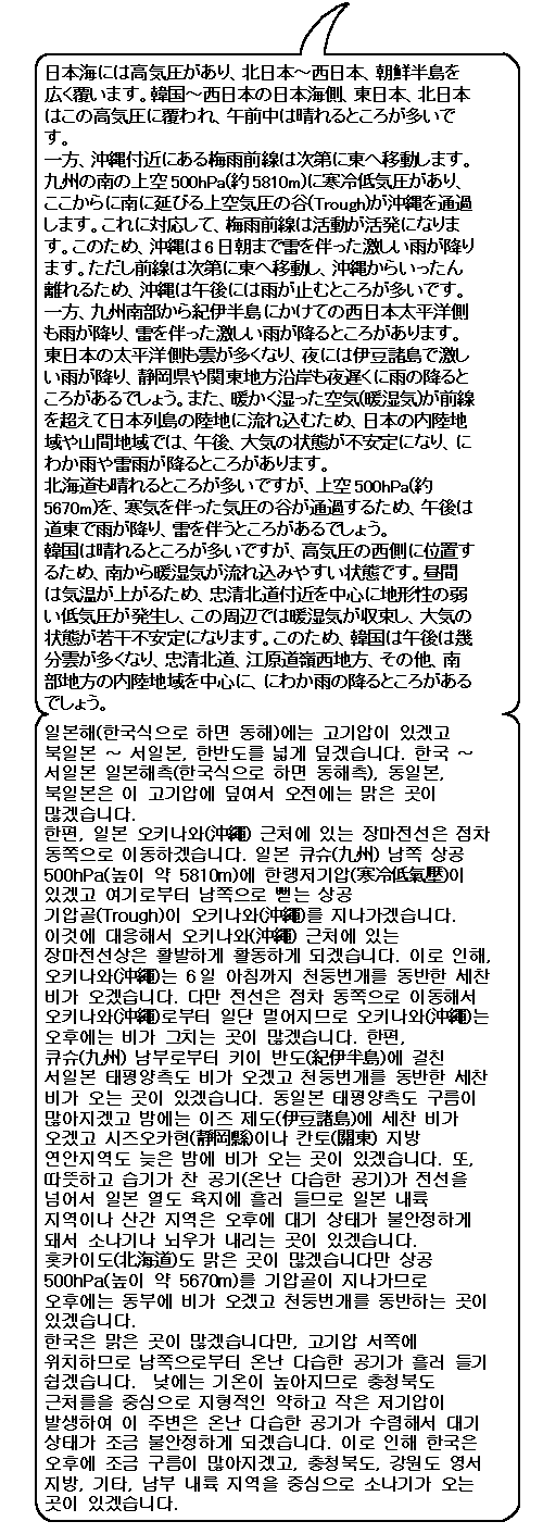 일본 오키나와(沖繩)는 오전 동안까지 세찬 비가 오겠어요. 또 일본 큐슈(九州) 남부나 시코쿠(四國)도 내일은 비가 오겠어요. 그 밖 지역은 일본도 한국도 맑은 곳이 많겠지만요 일본열도 태평양측은 오후에 점차 구름이 많아지겠어요. 또 일본도 한국도 내륙 지역은 오후에 소나기가 오는 곳이 있겠어요.