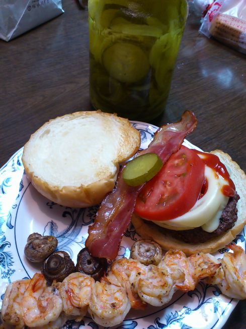 海老BBQとハンバーガーです 去年自分で漬けたピクルス(庭で採れた胡瓜)初めて食べましたが とてもよく漬かっていました^^