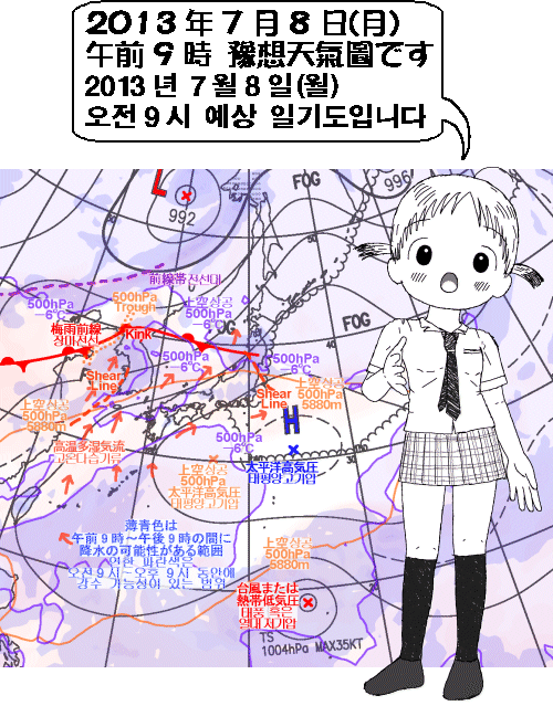 태평양고기압 세력이 강해져서 장마전선은 북상하면서 점차 쇠약하겠습니다만 중국 북동지방으로부터 화북(華北)에 걸쳐서 다른 전선대(前線帶)이 점차 명료하게 돼서 10일 이후에 한반도에 걸리게 되겠습니다.