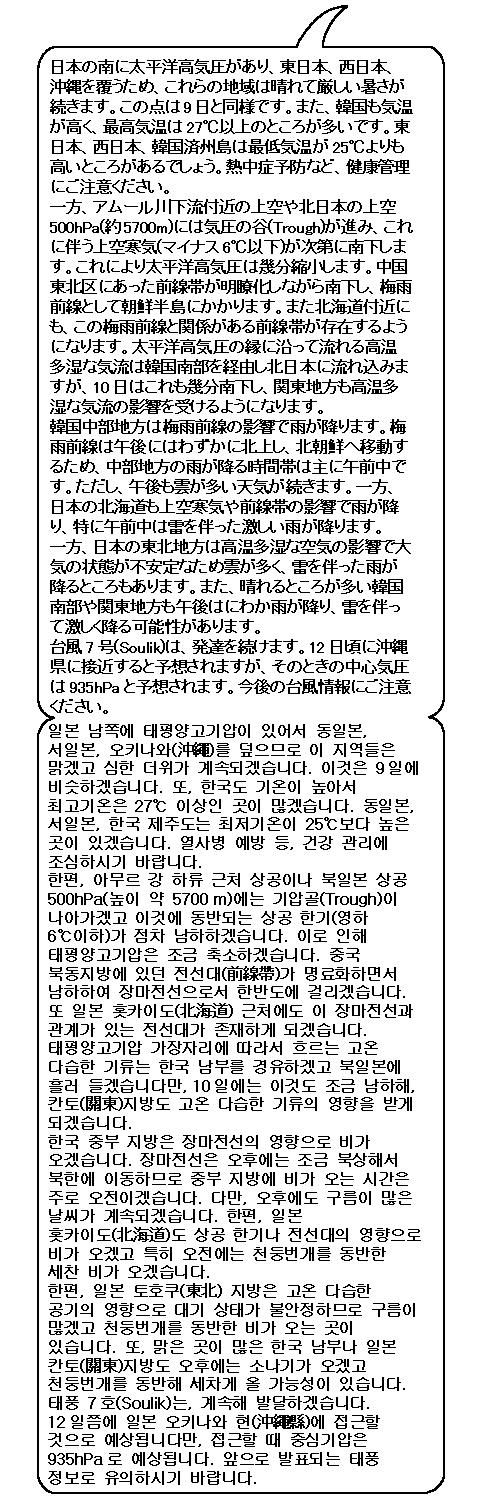 오늘에 비슷한 더운 날씨이겠습니다만 한반도에 현저한 장마전선이 있어서 한국 중부지방에는 본격적인 비가 오겠습니다. 한편 북일본에 생긴 불안정한 날씨가 칸토(關東) 지방까지 남하하겠습니다. 세찬 소나기가 오는 범위가 오늘보다 조금 퍼지겠습니다.