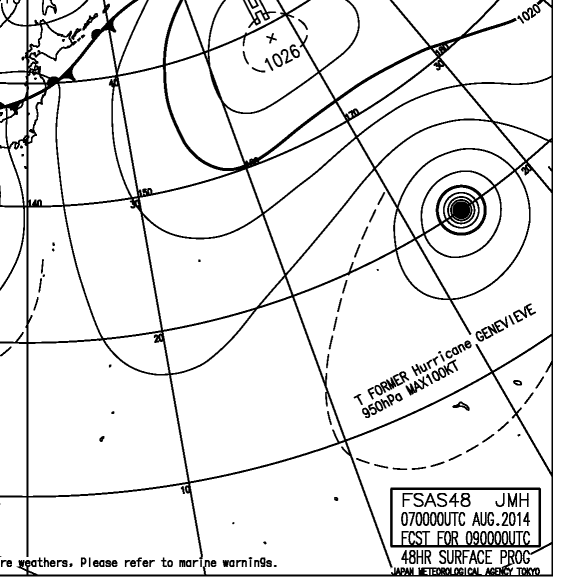 図は、2014年8月7日に作成された、2日後の予想天気図ですが、経度180度付近に台風があり、その傍らには、