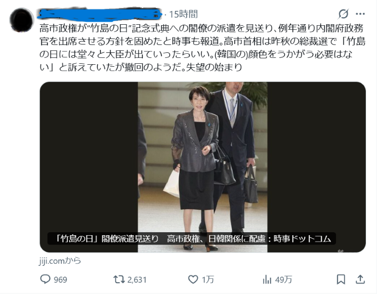 彼のTweetにも変化が出てきた(竹島に対する過去発言と実際の行動の違いにおける失望感)