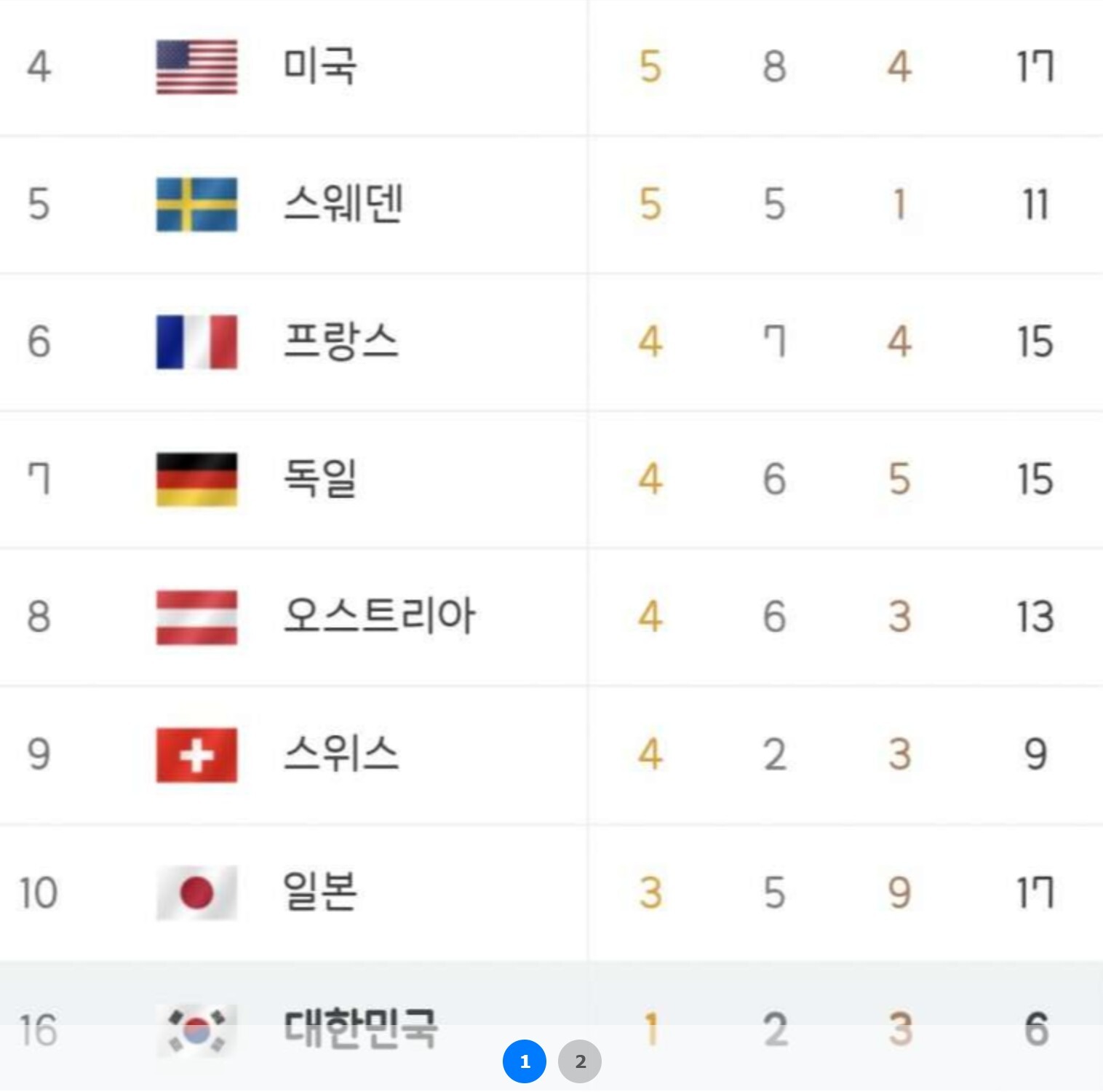 한국: 금1, 은2, 동 3(합계 6개)으로 세계 16위